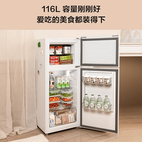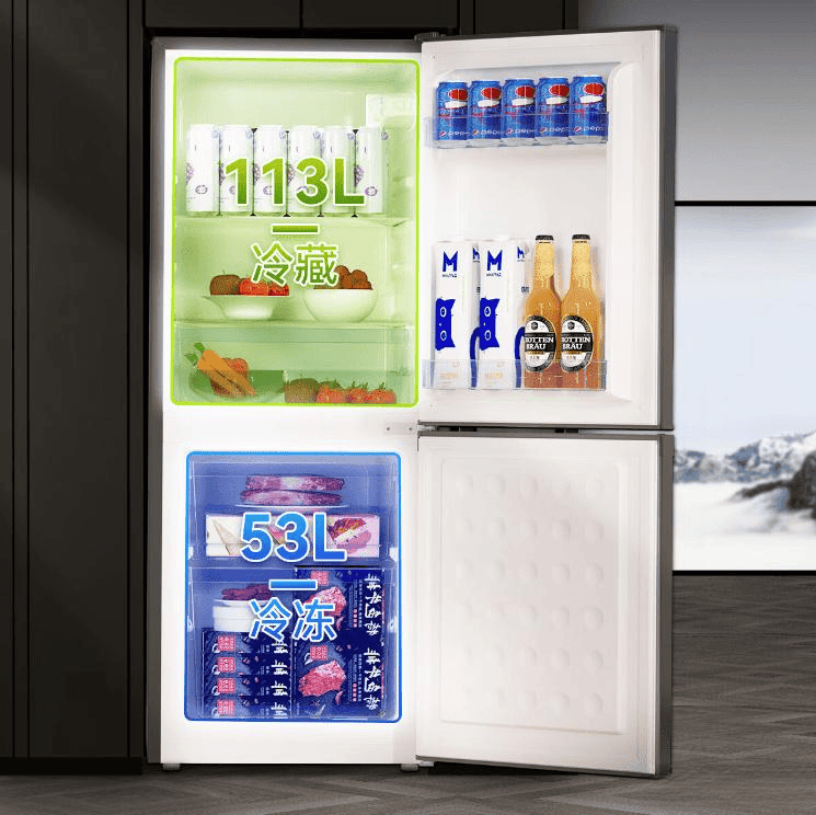 双门设计便利:双开门设计,冷藏和冷冻空间分开,取物方便,外观简洁时尚,适合小厨房或租房。