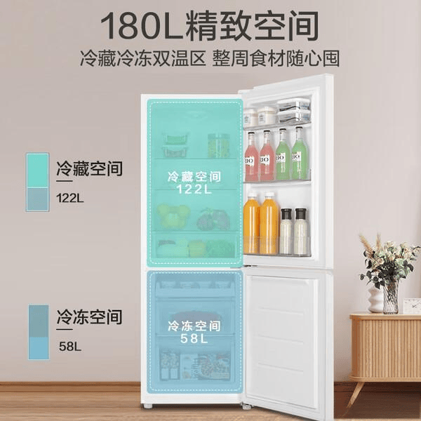 大容量存储:总容量180升,冷藏室122升,冷冻室58升,适合一家人一周的食材存放,分类存放方便。