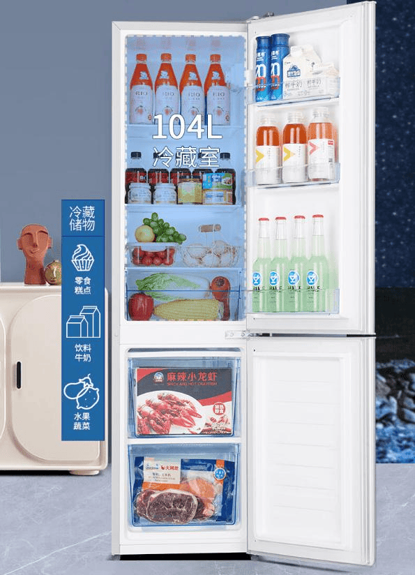 大容量储存:这款冰箱内部空间充足,104升的冷藏室和46升的冷冻室,轻松放下肉、菜、水果等,适合家庭使用或放在出租屋。