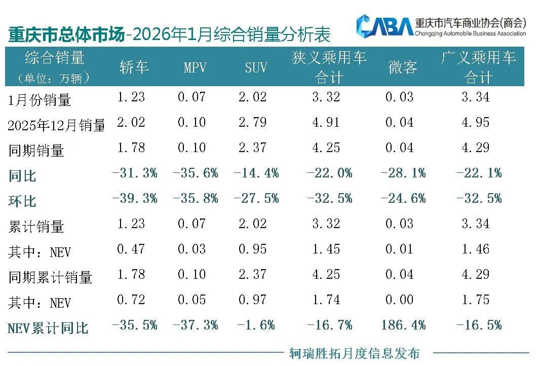 刚迈入2026年,国内车市就给大家泼了一盆冷水,受新能源车购置税政策退坡以及相关市场因素影响,全国乘用车市场及重庆市场走势,均出现不同程度的下滑。