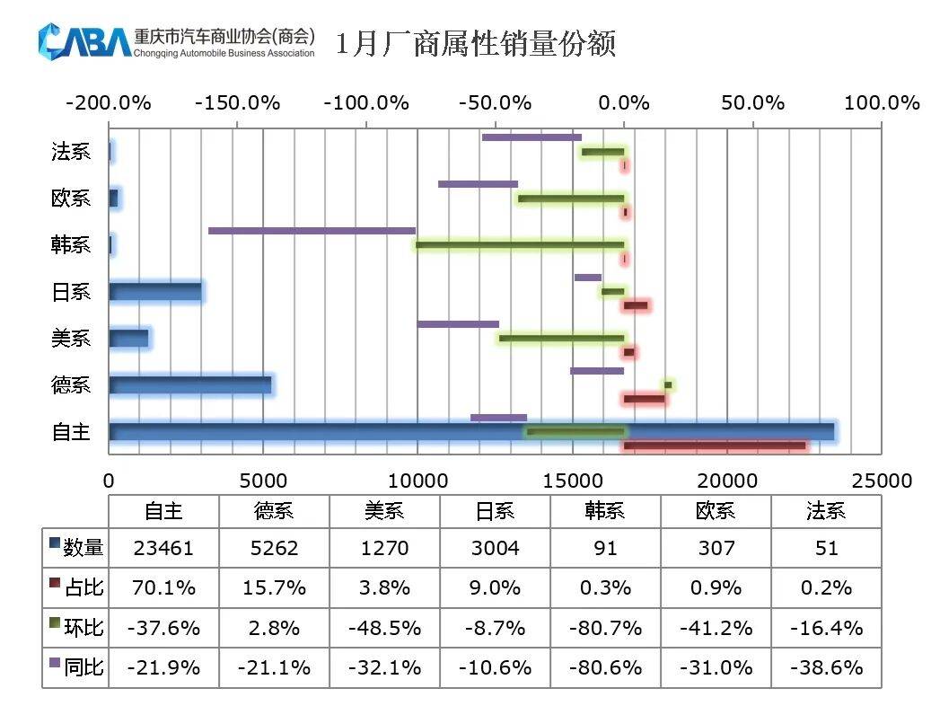 具体来看:1月份,重庆市场轿车销量1.23万辆,同比下滑31.3%,环比下滑39.3%;SUV销量2.02万辆,同比下滑14.4%,环比下滑27.5%;MPV销量为0.07万辆,同比下滑35.6%,环比下滑35.8%。