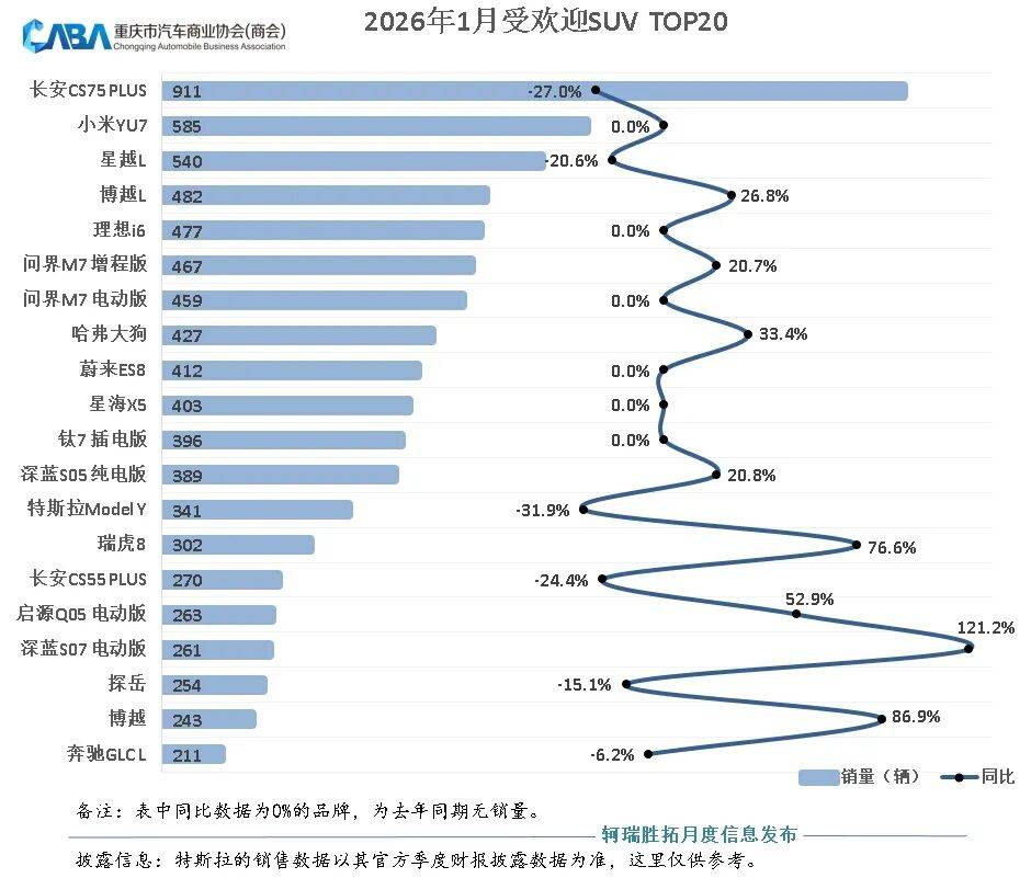 再看1月受欢迎SUV TOP20,会发现长安CS75 PLUS继续发挥本土品牌优势,以911辆的断层领先表现位居第一名,其次小米YU7销量585辆,坐稳第二;星越L销量540辆,位居排名第三。