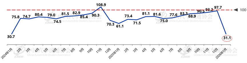 数据显示:2026年1月汽车消费指数为31.1,低于上月;1月入店分指数为27.1,低于上月,预计2月份销量相较1月有所下降。