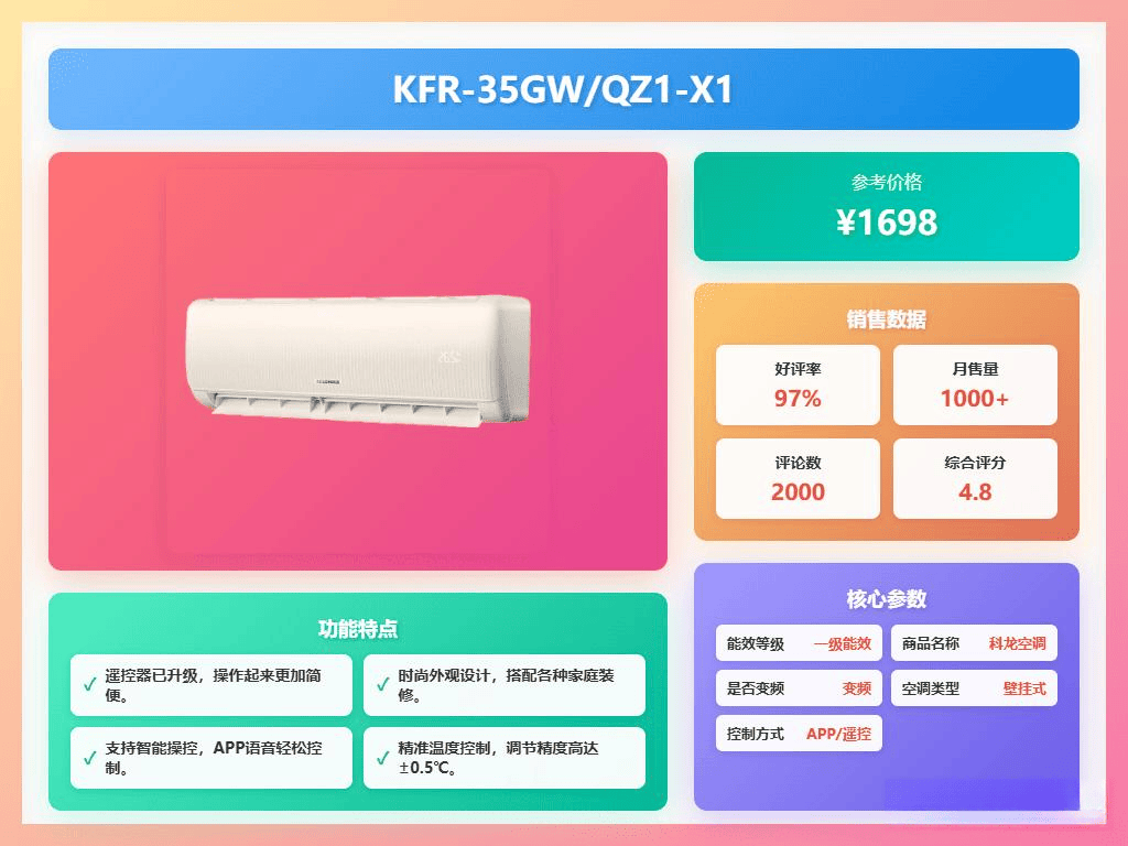 亮点:一级能效、静音运行、智能控温、快速制冷制暖