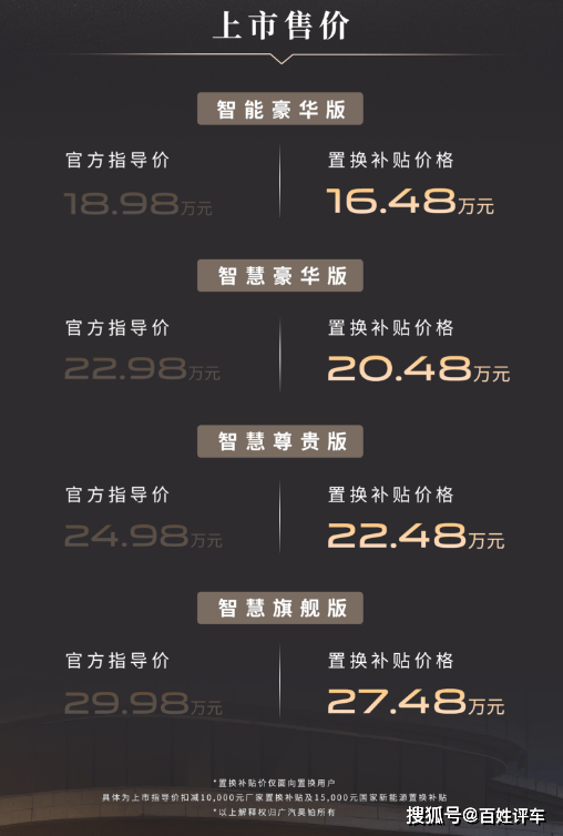 智慧尊贵版:指导价24.98万元,补贴价22.48万元(顶格豪华安全);