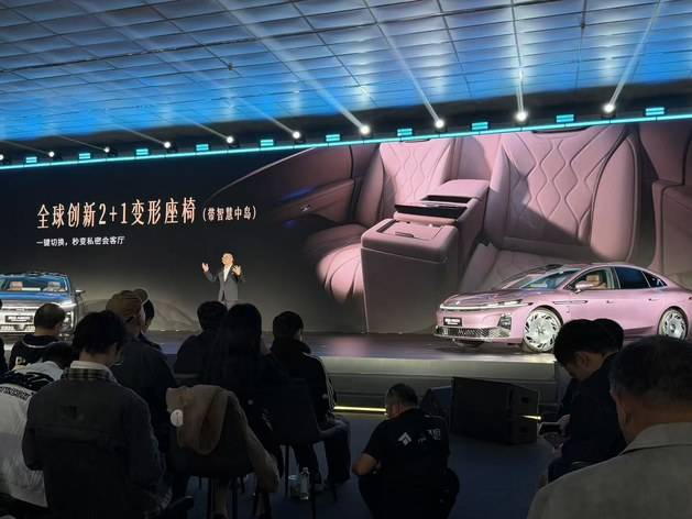进入车内,新车以“星际座舱”为理念,采用环抱式布局与极简设计风格。Nappa真皮与麂皮材质覆盖中控台,搭配金属拉丝饰板与菱格缝线工艺,营造豪华质感。全球首创的2+1后排变形座椅成为亮点:一键切换四座模式后,中央扶手集成触控屏,可独立控制空调、座椅与多媒体;五座模式下,后排地台纯平设计与剧院式座椅布局提升舒适性。