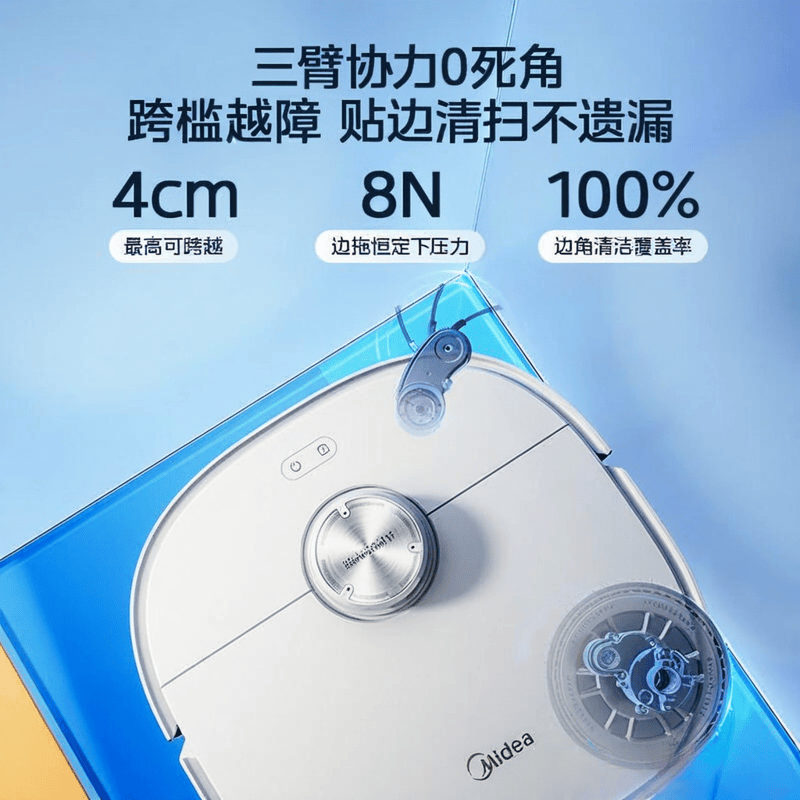 - 仿生机械臂:边刷可伸缩至墙根1mm缝隙,彻底根治墙角积灰难题。