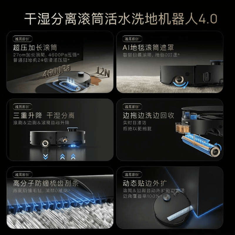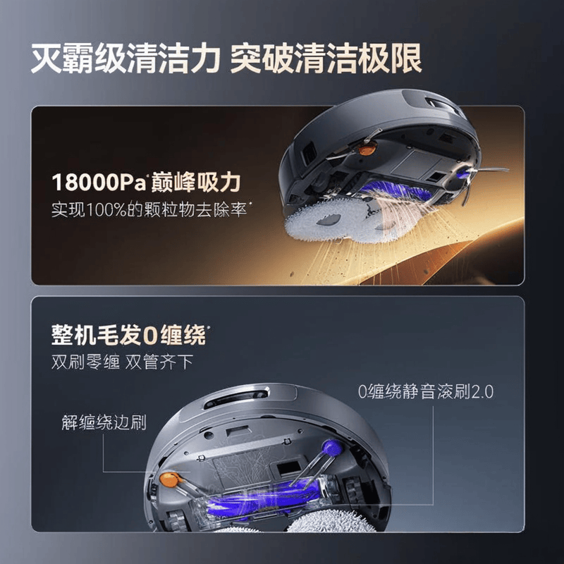 - 扫拖洗烘一体:吸拖同步完成,基站自动清洗+热风烘干,告别手洗拖布的烦恼。