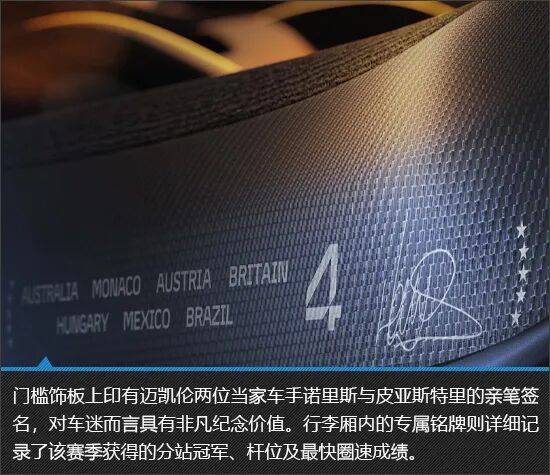 迈凯伦Artura Spider MCL39 Championship Edition在座舱内融入了更为丰富的致敬元素,尤其是对2025赛季每一场分站冠军的记录,纪念意义尤为深刻。当你坐进这样一个承载着荣耀的座舱时,既是在驾驶一台顶级超跑,也是在与车队和车手的辉煌时刻产生情感共鸣。