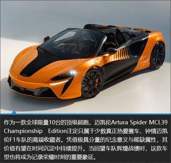 为庆祝迈凯伦F1车队斩获第十个一级方程式车队总冠军,并实现背靠背夺冠的历史性成就,迈凯伦特别推出限量版车型——Artura Spider MCL39 Championship Edition。新车全球限量10台,为车迷近距离参与并见证迈凯伦F1辉煌时刻提供了极具纪念意义的收藏选择。