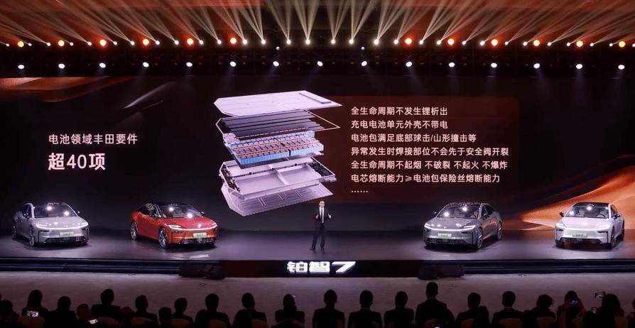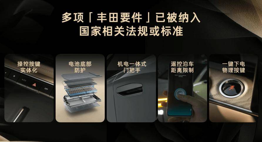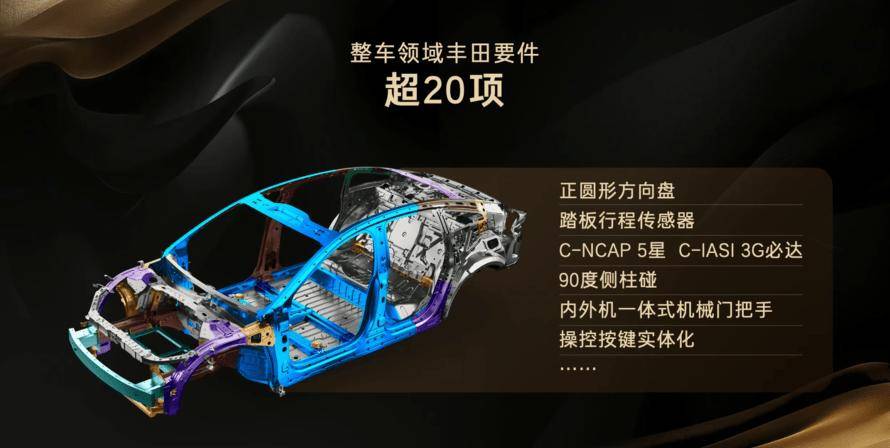新车采用整车领域丰田要件超 20 项,包括正圆形方向盘、踏板行程传感器、C-NCAP 5 星、C-IASI 3G 必达、90 度侧柱碰、内外机一体式机械门把手、操控按键实体化等。电池领域丰田要件超 40 项,包括全生命周期不发生锂析出、充电电池单元外壳不带电等。