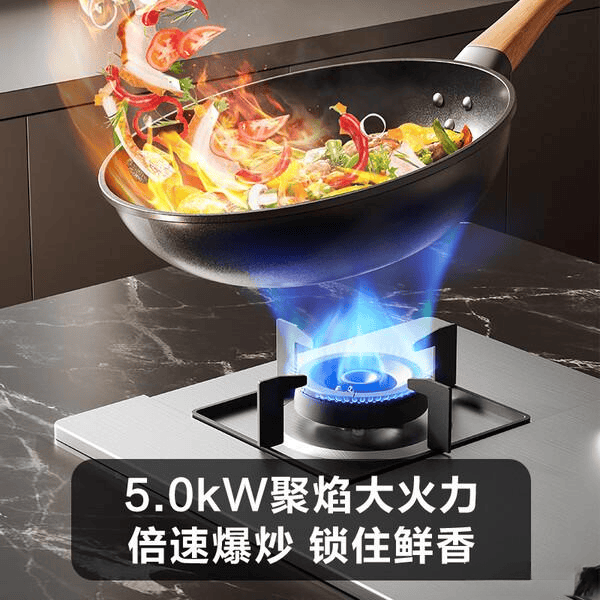 在能效方面,这款灶具达到70%的超一级能效等级,在保持强劲火力的同时,也相当省气。它的燃烧采用多重进气补氧技术,空气和燃气充分混合,燃烧更充分、废气更少,既环保又省钱。熄火保护装置也加入其中,确保意外熄火后气源会自动切断,安全性相对较高。