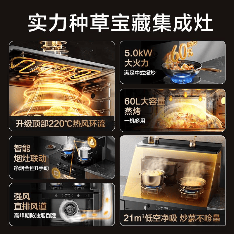 - 强劲吸烟,保持清新:先进烟灶联动技术,21m³/min强排风量,有效去除油烟。