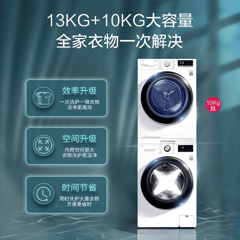首先,我们来看看LG的容慧大容量洗烘套装。这款组合包括13公斤全自动滚筒洗衣机和10公斤双变频烘干机,专为大家庭设计。它的核心技术是360°速净喷淋技术,通过多角度水流冲洗衣物,连油渍、汗渍都能洗得干干净净,省去手搓的麻烦。