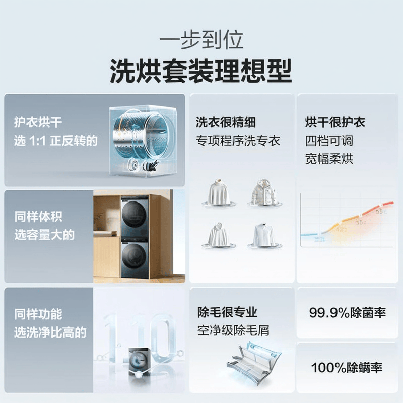烘干机采用双变频设计,能够智能调节温度和转速,既省电又能有效保护衣物,避免缩水。对于喜欢囤衣服或需要洗大件物品(如窗帘、厚毯子)的家庭来说,这款洗烘套装一次就能处理全家一周的衣物,省时省力。此外,它还具备自动监测衣物湿度的功能,避免烘干过头,搭配蒸汽除菌功能,洗后的衣物柔软蓬松,穿起来更安心。