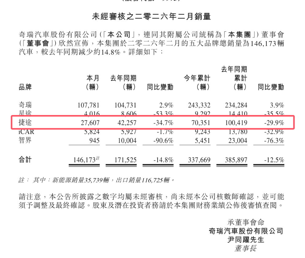 3月1日,奇瑞汽车股份有限公司发布的一份未经审核的销量快报。数据显示,刚刚过去的2月份,捷途品牌单月销量为27607台,相比去年同期,销量下滑了34.7%。那么,捷途汽车是遭遇了“倒春寒”吗?