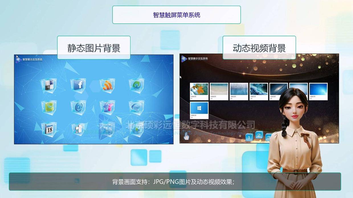 一整套便捷的菜单系统,内置多种不同的展示形式,可任意选择,来满足不同的展示场景需求,界面元素外置加载,方便更新替换;背景画面支持:JPG/PNG图片及动态视频效果;同时支持UDP/COM协议,在菜单按钮被选中的同时,可对灯光等环境设备做出协同控制,也可对扩展多屏系统进行联动控制;针对触屏设备的主流分辨率进行了适配,支持横屏、竖屏及自定义分辨率; 支持包括:触摸屏、电容屏、一体机、纳米触摸、透明屏等在内的主流