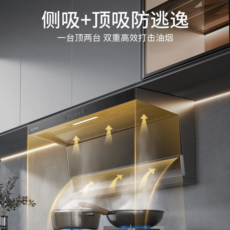 顶侧双吸:这款烟机同样采用顶吸和侧吸相结合的方式,能够更全面覆盖油烟源,确保油烟无处遁形,厨房空气更加清新,炒菜时油烟不再四散,省事不少。