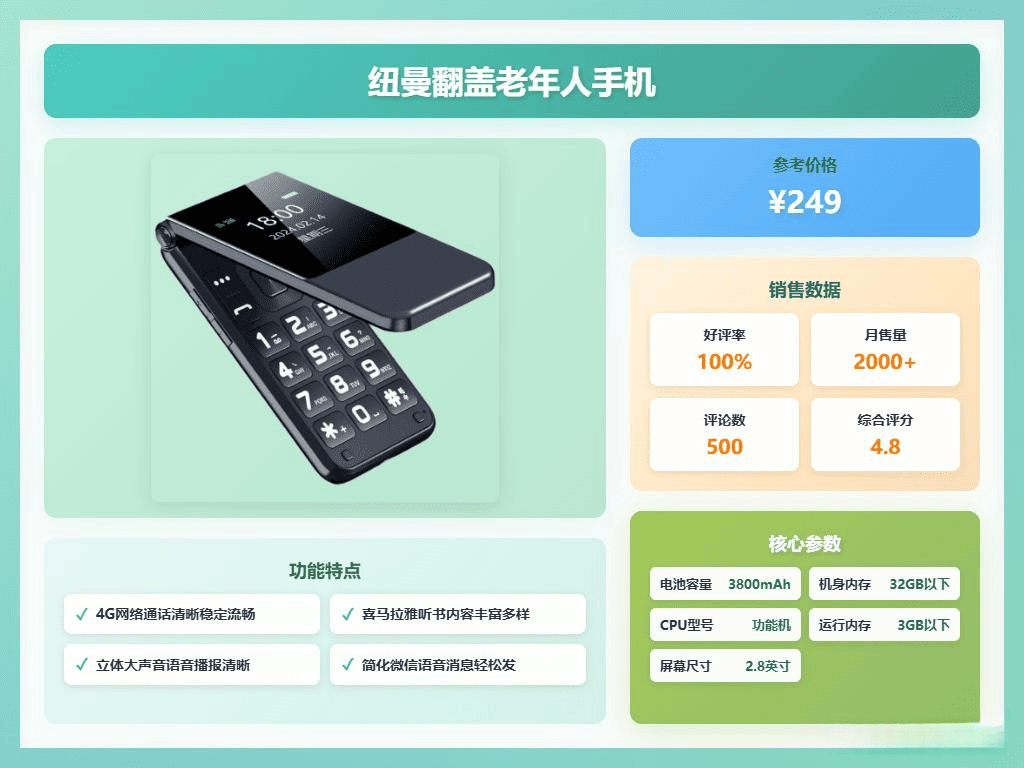 而如果长辈们更喜欢简单的操作,那么纽曼翻盖老年人手机是个不错的选择。翻盖接听和挂断的设计让操作变得更加简单便捷。在选购时,可以带着长辈们一起去实体店体验一下,看看他们更喜欢哪一款,毕竟适合他们的才是最好的!