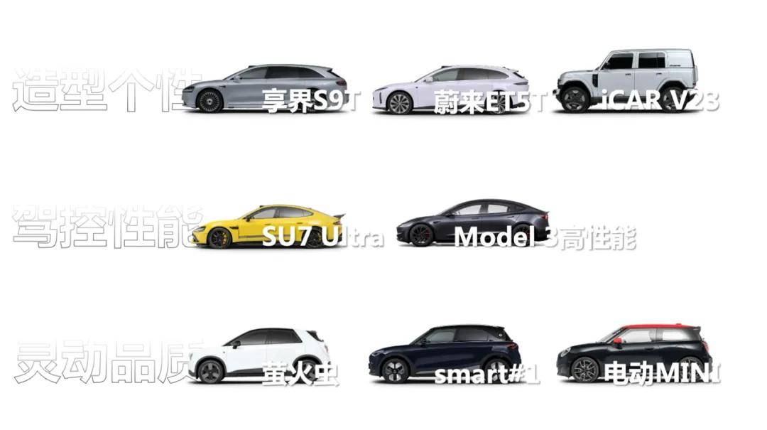 第一类是造型个性的风格,代表车型是旅行车、猎装车以及方盒子车型;第二类是驾控性能的风格,代表车型是Model 3高性能版、SU7 Ultra等车型;第三类是灵动品质的风格,代表车型是萤火虫、smart、电动MINI等车型。