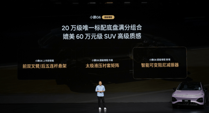 小鹏G6超级增程全系标配太极AI底盘,同级唯一标配前双叉臂/后五连杆独立悬架+太极液压衬套矩阵+智能可变阻尼减振器,以20万级唯一标配底盘满分组合,拥有媲美60万级SUV的高级质感,让每位驾乘者都能拥有良好的体验。