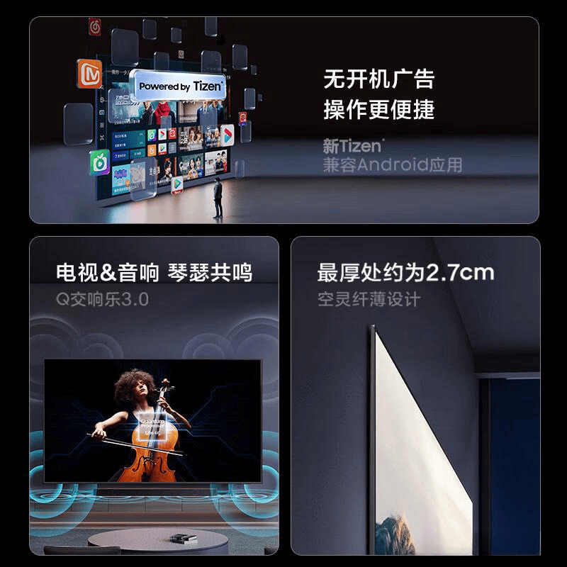 这款电视的超薄机身仅有27.9mm厚,挂在墙上几乎与墙面融为一体,98%的屏占比让你在观看电影时仿佛置身于画中,观看球赛时运动员似乎要冲出屏幕!智能体验方面也非常出色:多视窗模式让你可以边看菜谱边下厨,Bixby语音助手只需一句“打开Netflix并调暗屏幕”便可轻松完成操作,Tizen系统的开机速度仅需1.3秒,快于普通安卓TV 40%。动态加速240Hz技术有效消除了拖影,观看飙车戏时畅快淋漓,抗反射屏技术则确保白天观看时也能清晰看到暗部细节。对于追求画质和颜值的家庭来说,三星的这款电视绝对值得入手!