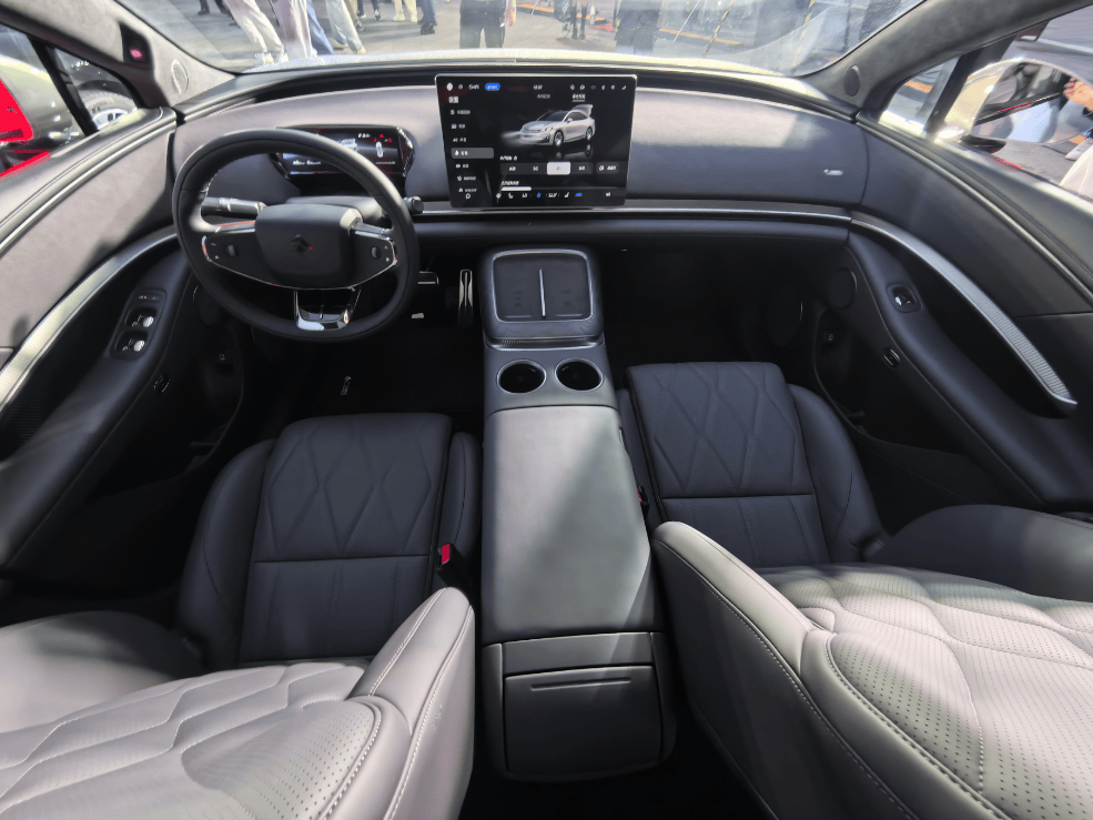 进入车内,昊铂A800运用了前后双环抱式座舱设计,前排基于华为鸿蒙座舱HarmonySpace 5打造,配备12.3英寸全液晶仪表、27英寸W-HUD、15.6英寸中控屏,支持多设备协同交互。