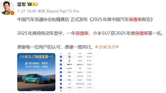 值得一 提的是,此次中国汽车流通协会与精真估联合发布2月纯电车型保值率最新数据,榜单 格局较1月发布的《2025年度中国汽车保值率报告》发生显著变化。在今年 1月27日,雷军转发了 中国汽车流通协会和精真估 正式发布的《2025年度中国汽车 保值率 报告》 2025年度纯电动车型中,一年 保值率 ,小米SU7 以86.05% 获2025年度 保值率 第一名。而问界M9以82.44%排名第二位。