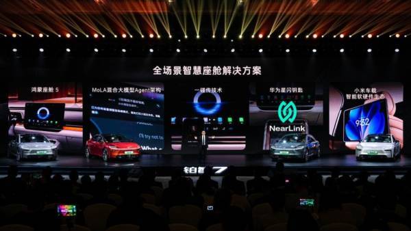 在智能化方面,铂智7采用华为鸿蒙座舱5系统,并搭载MoLA混合大模型架构,支持语音助手、应用生态以及多场景车控功能。此外,新车还配备了小米车载智能软硬件生态,小米平板可接入后排娱乐系统。