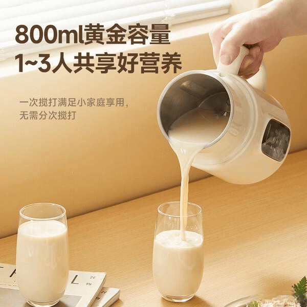 小巧容量够用:800毫升的容量,对于1-3人的家庭来说,刚刚好。早上起来想喝个豆浆,或者晚上想熬个浓汤,一次就能做好全家人的份。而且机器本身也不大,厨房台面不大的话放着也挺方便。