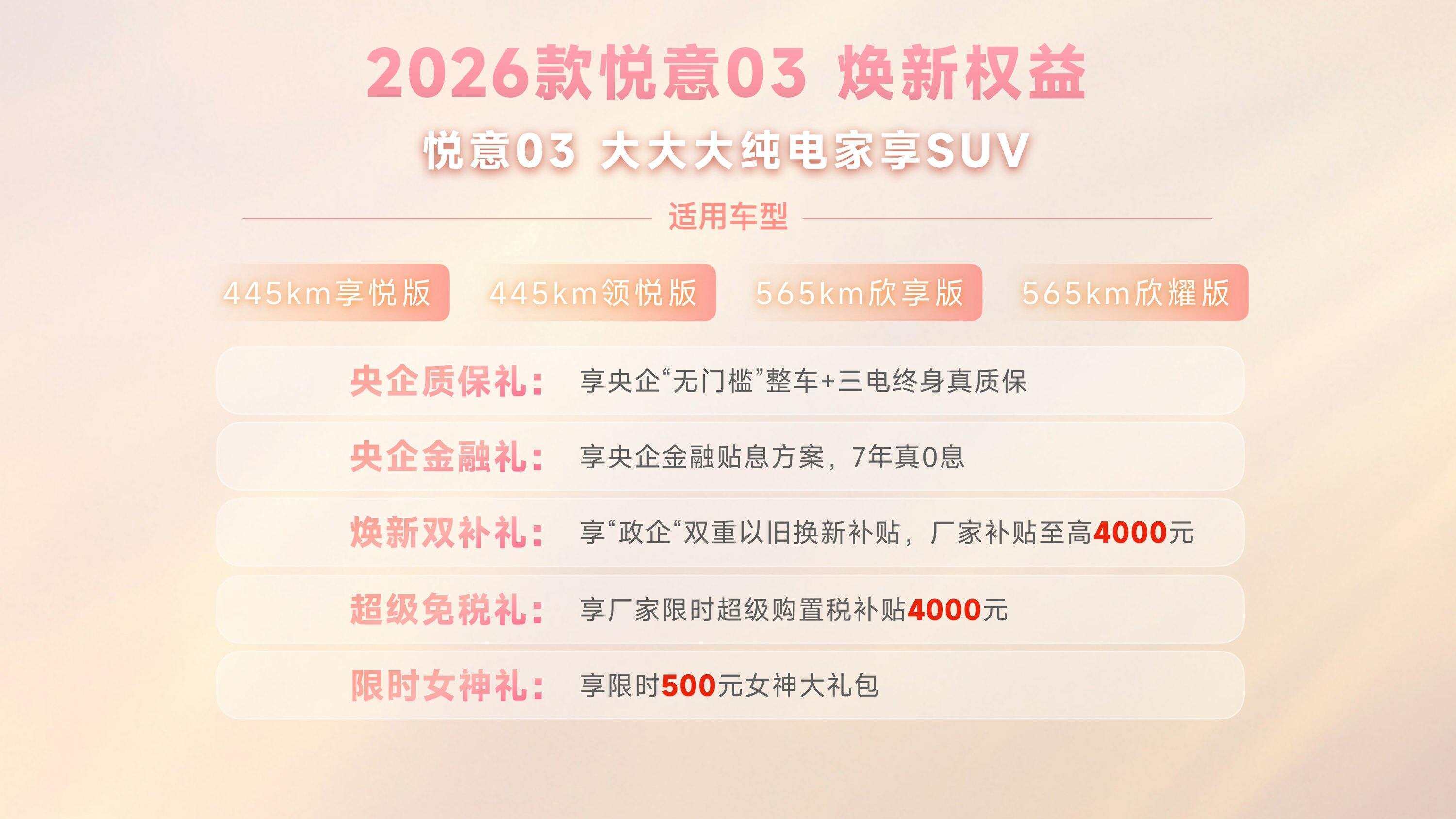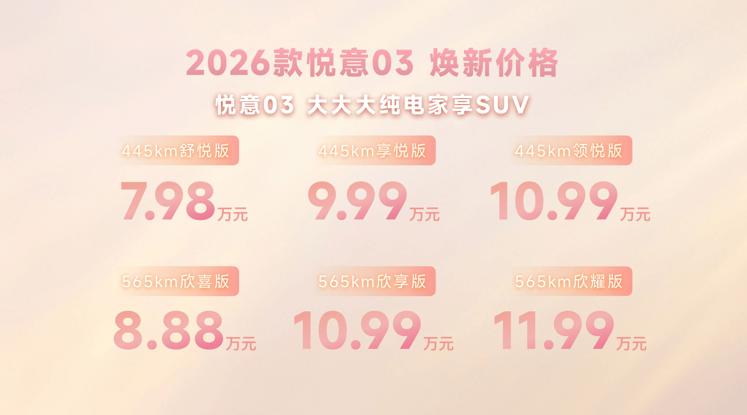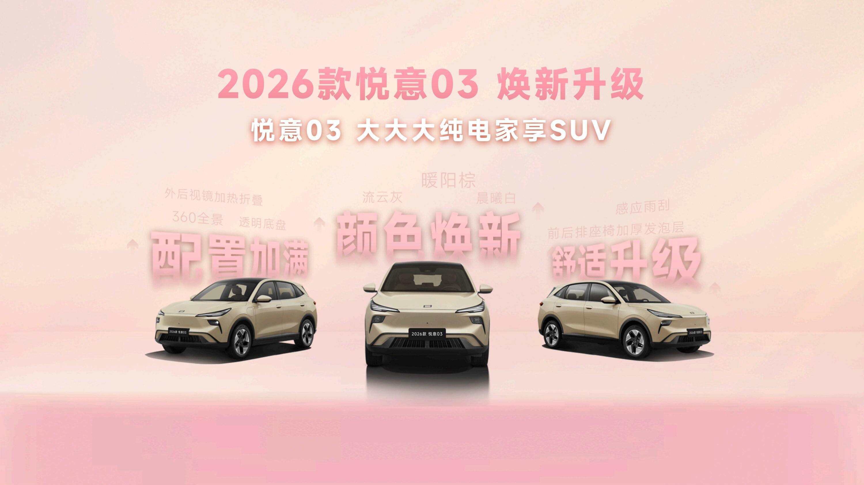 2026款悦意03的上市,进一步丰富了纯电家享SUV市场的产品选择,其针对家庭用户尤其是女性用户的升级方向,以及高性价比的定价和多重购车权益,精准贴合家庭纯电出行的核心需求,为消费者带来更具品质的纯电用车选择。