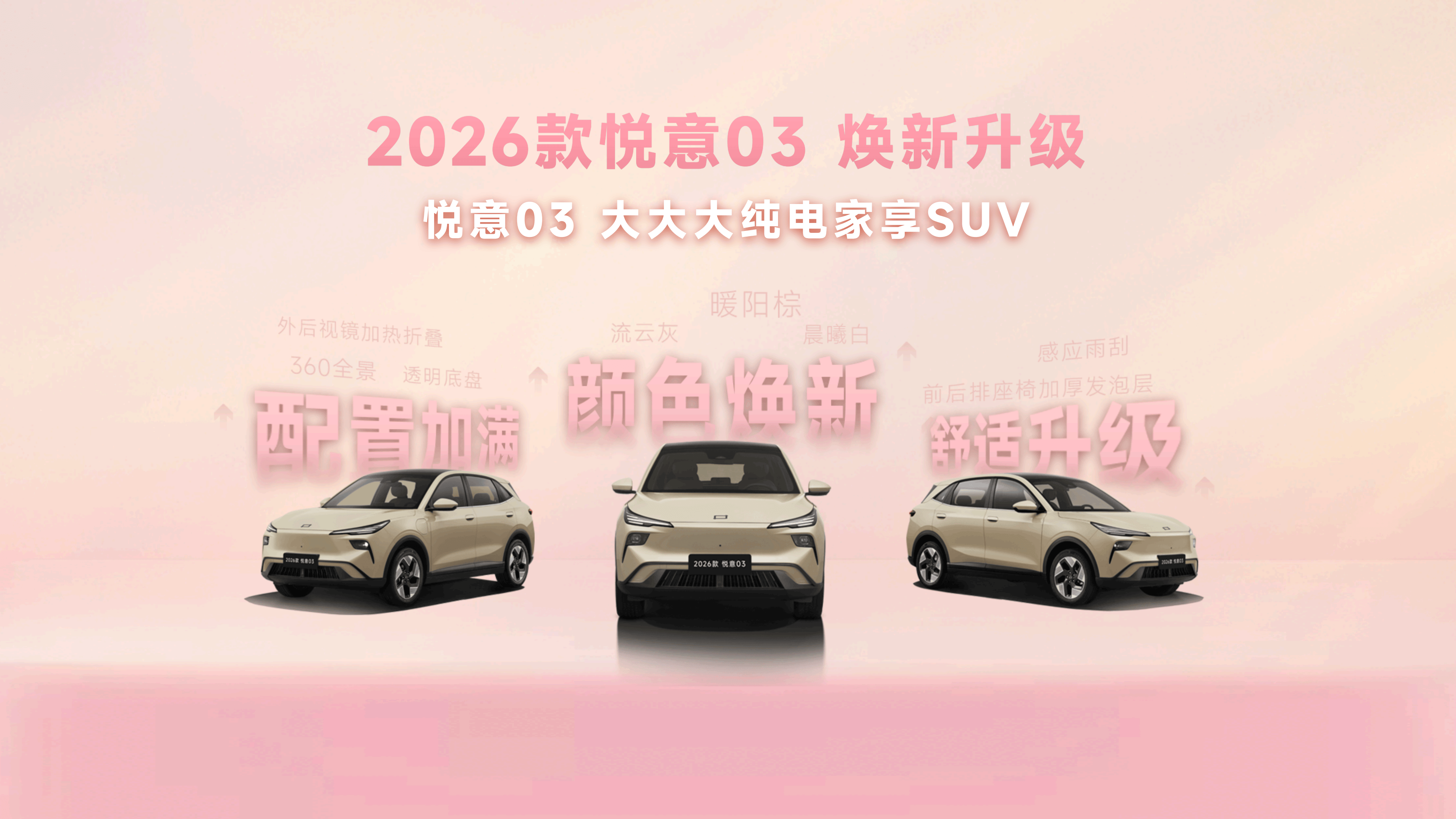 围绕年轻小家庭,尤其是家庭女性用户的进阶需求,从颜色推新到舒适满配,2026款悦意03带来全新晨晖金车色、晨曦白内饰色等20余项升级,让用车更舒心、开车更省心、养车更安心,正如张若昀所说:“悦意03是真舒适的纯电SUV。”