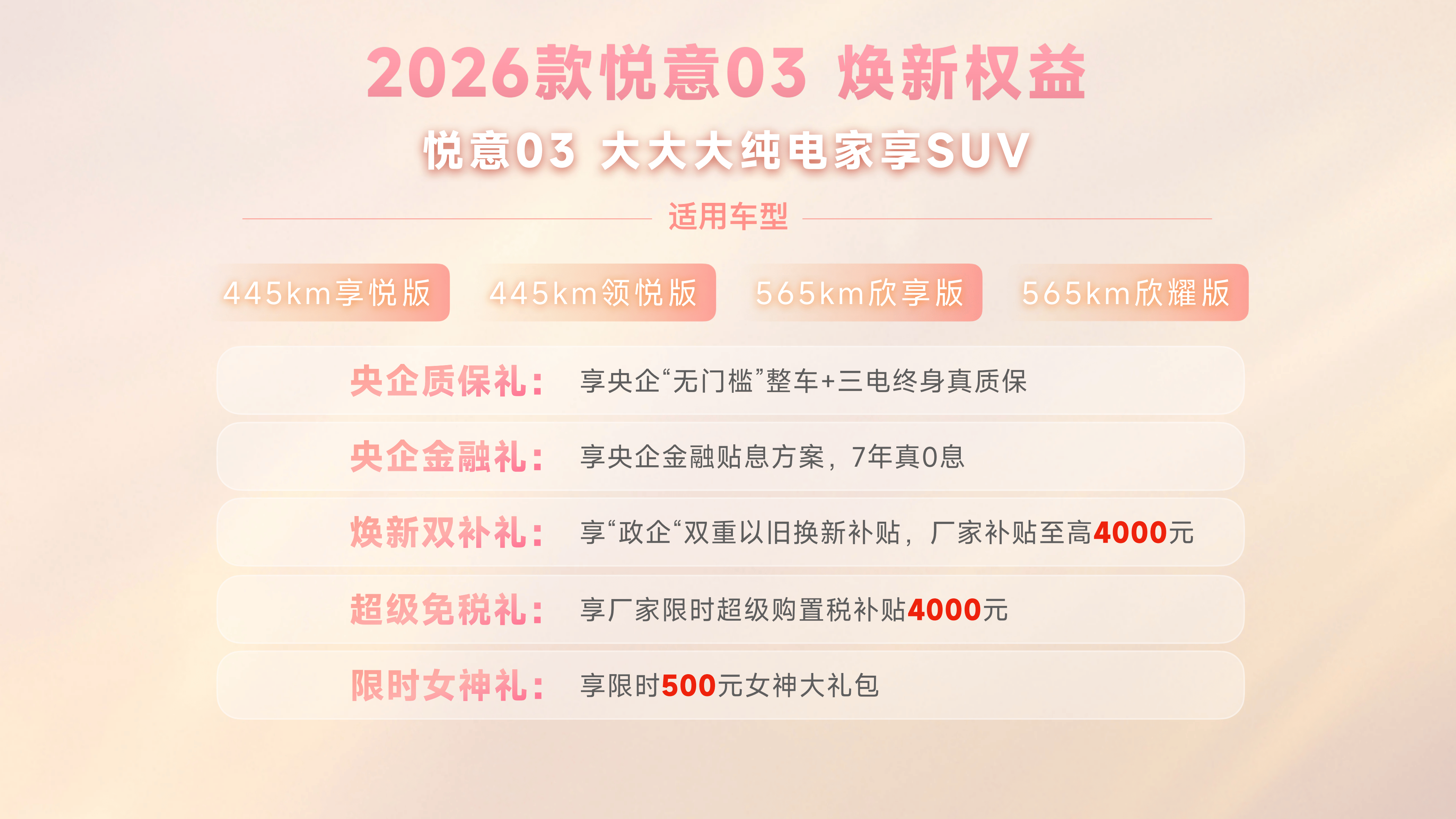 为了让更多家庭轻松拥有这份“悦意”,2026款悦意03还重磅推出央企五重礼遇。购车即享央企质保礼,“无门槛”整车及三电终身质保真诚以待,更有7年真0息央企金融礼,极大降低拥车门槛,同时,新车叠加焕新双补礼,政企双重以旧换新补贴至高4000元,以及限时4000元购置税补贴的超级免税礼、限时500元的开学/开工礼。特别值得一提的是,还有限时半价权益,可升级价值4000元的舒适选装包(具体优惠政策请详询当地经销商)。在这个女神节,让爱与梦想零负担启程。