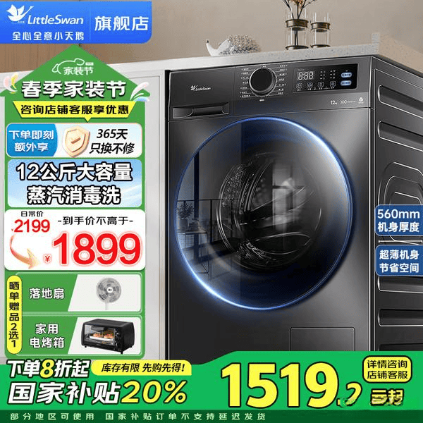 最后,我要推荐的是小天鹅洗衣机全自动滚筒12公斤大容量洗脱/洗烘一体机。这款洗衣机具备12公斤的超大洗涤容量,轻松应对一家人的大件衣物,如床单、被套等,不用担心洗涤次数减少,给你更多的时间做自己想做的事情。